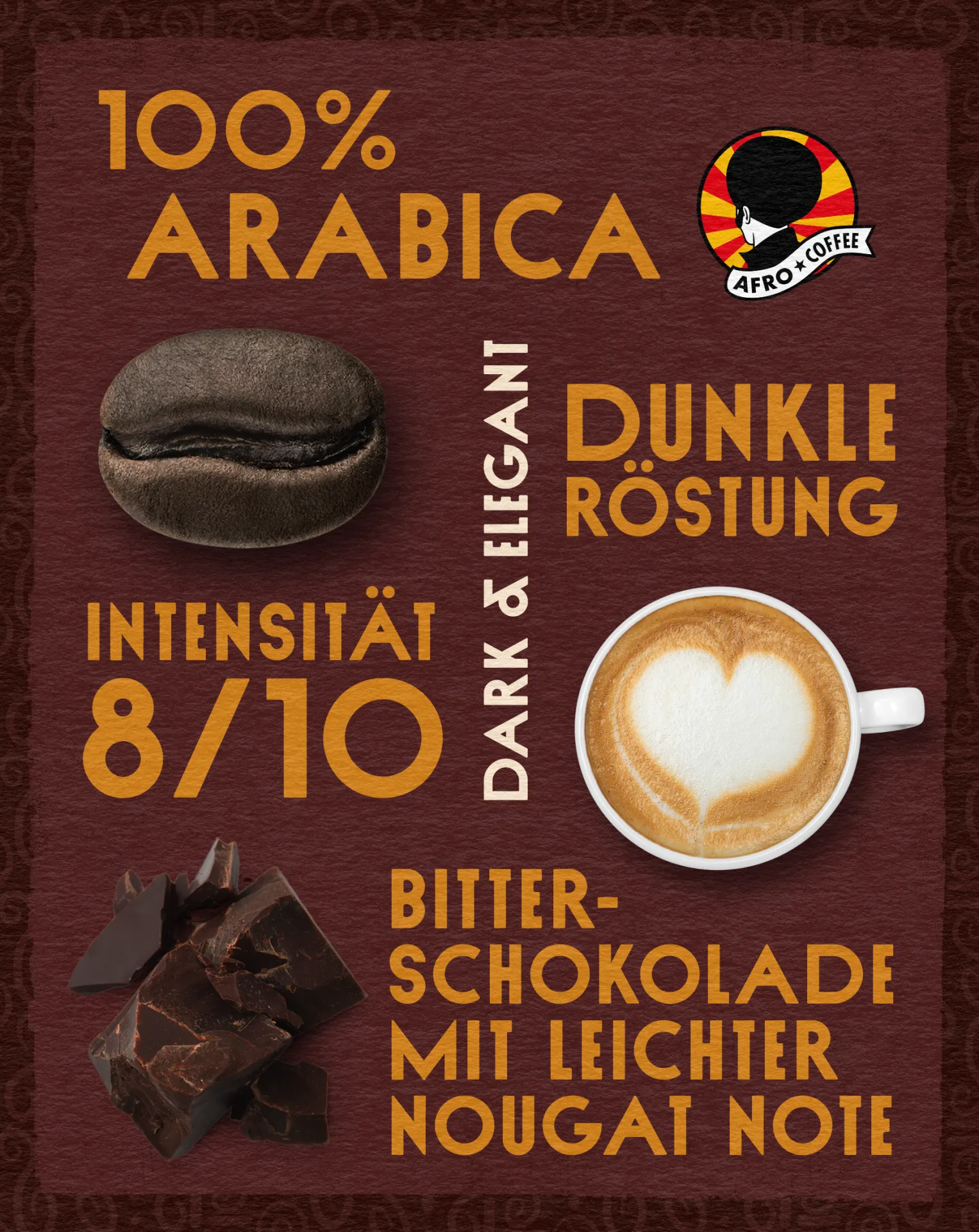 Dark & Elegant: Gehaltvolle Eleganz trifft auf feine Würze. Arabica Genuss in Reinkultur. Wo sich Nuancen von Bitterschokolade und subtiler Frucht in tiefer Röstung entfalten.