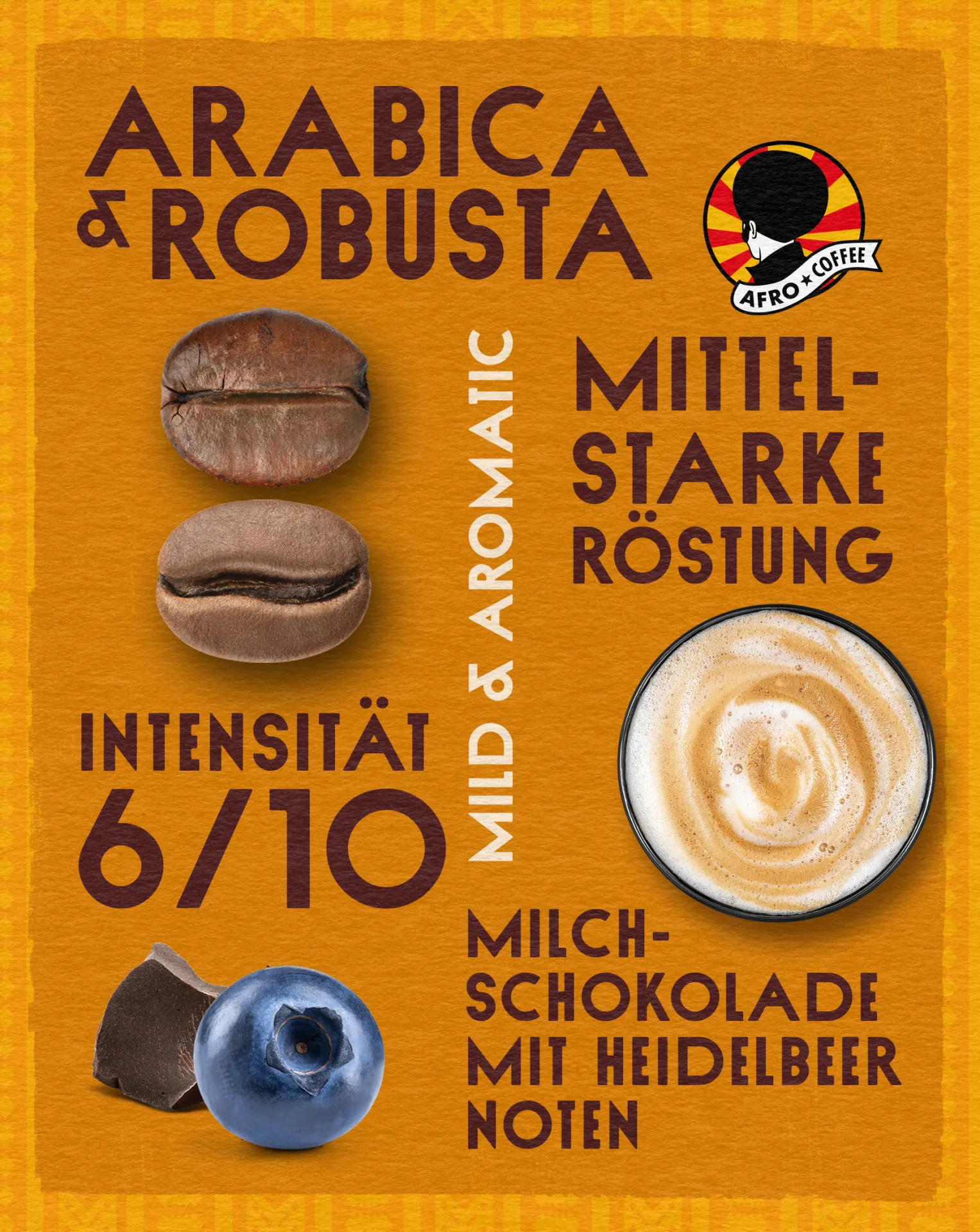 Arabica und Robusta Sorten in harmonischer Synergie. Die mittelstarke Röstung entfaltet einen runden Körper mit dezent blumigem Geschmack.
