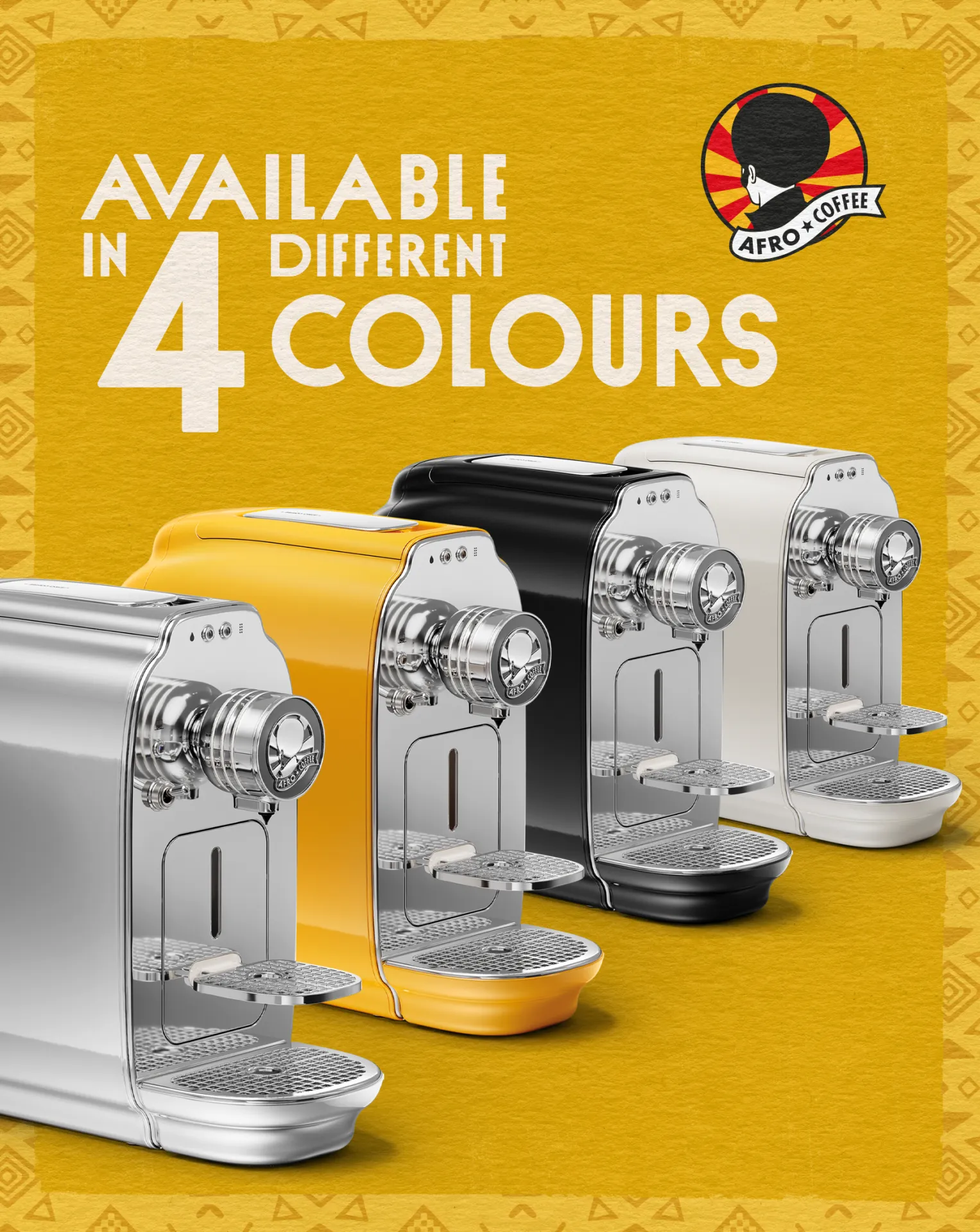 Our new Afro Coffee Kahawa capsule machine: Four colors, four personalities – Chrome, Espresso Black, Ivory White, Savannah Yellow.